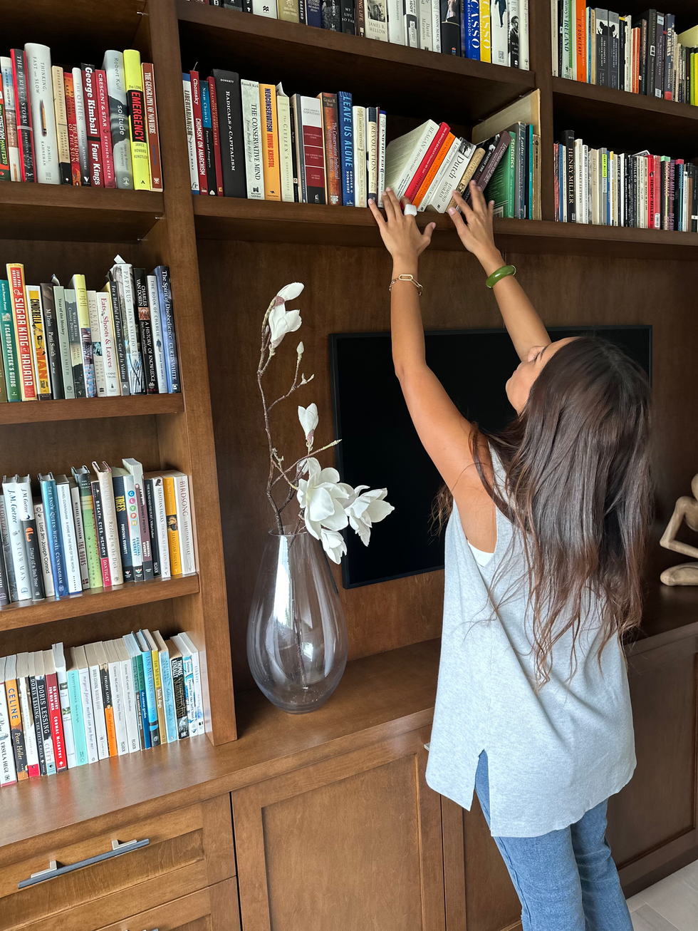 This home study is where the creativity flows with a fully custom millwork made out of rich walnut, stained to contrast our oak wood flooring. Two- toned knurled cabinets pulls were incorporated adding some texture and visual interest. This room was designed to keep all of our clients book collections together and providing them with a great space where they can either relax while reading or just seat back and enjoy a good TV show.